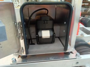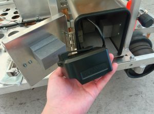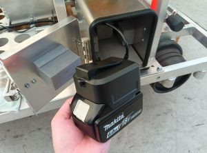 今後は、マキタ製のリチウムイオン電池とDC-DCコンバーターを用いて灯火器に給電する仕様へと変更させていただきます。運転席下に設置するバッテリーボックス内のアダプターにバッテリーをセットすると、灯火器等が使用可能になります。